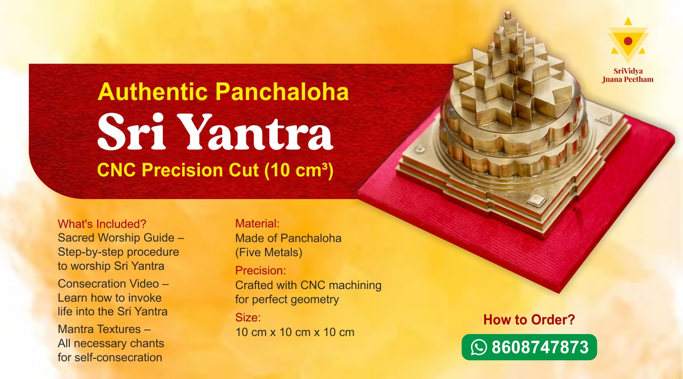 At the heart of Sri Vidya is the Sri Chakra (Sri Yantra)—a mystical geometric diagram made of interlocking triangles. It symbolizes the universe, the human body, and the presence of the Divine Mother. Practicing meditation or ritual worship with the Sri Chakra helps purify the mind, balance energy, and connect with higher states of consciousness.